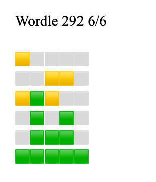 Wordle is a game in which players have 6 attempts to guess one five-letter word; every time a player enters a word, the site offers hints, given by colors: when the letter is yellow, it’s in the word but in the wrong spot; colored green, the letter is in the right spot; if it’s completely grayed out, it’s not present in the word at all. When the word is right, you win the game, and the site shows the player their statistics, or how many words they’ve gotten right in a row, and the percentage of how many games they’ve played versus won.
