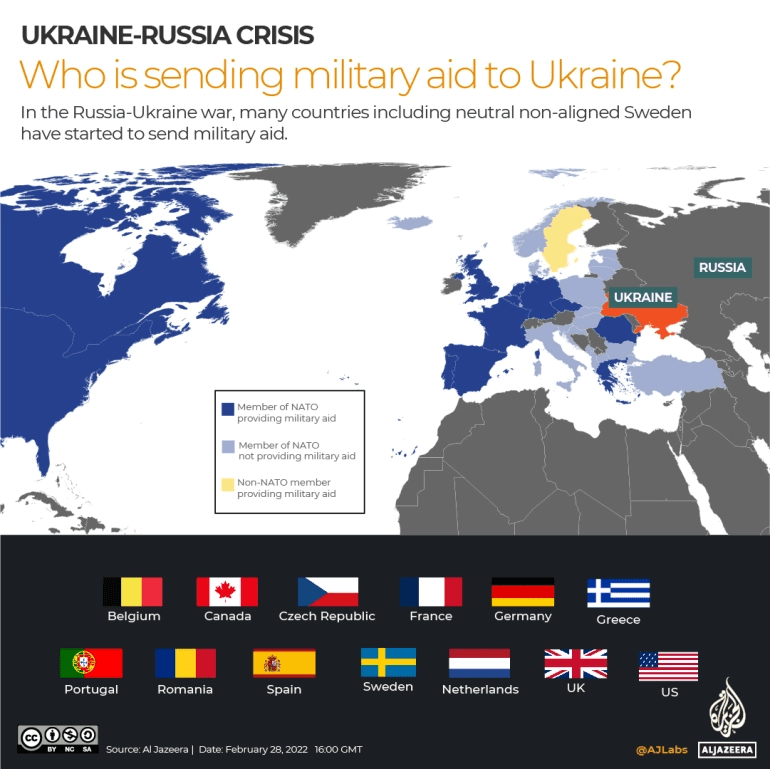 Overall, the world has been supporting Ukraine, as shown by the number of countries that have sent military aid to them, including Belgium, Canada, the Czech Republic, France, Germany, Greece, Portugal, Romania, and Sweden (which is not a part of NATO), Spain, the Netherlands, the United Kingdom, and finally the United States (Aljazeera). Regarding the countries that are supporting Russia, the only country that has helped them so far is their neighboring country, Belarus. Belarus has allowed Russian troops to enter Ukraine through their territory, which facilitates the Russian invasion in north Ukraine, which is very near Kyiv. Regardless of this help from Belarus, Russian troops were not able to reach and conquer the Ukrainian capital, Kyiv. When it comes to the overall victories and defeats of the war, there hasn’t really been any major position of victory or defeat. Other than a small victory that Ukraine had in Russia ultimately not being able to reach Kyiv, nobody is winning the war. Russian troops have not conquered anything of great significance, while the Ukrainians aren’t winning either since their county is currently occupied by another.