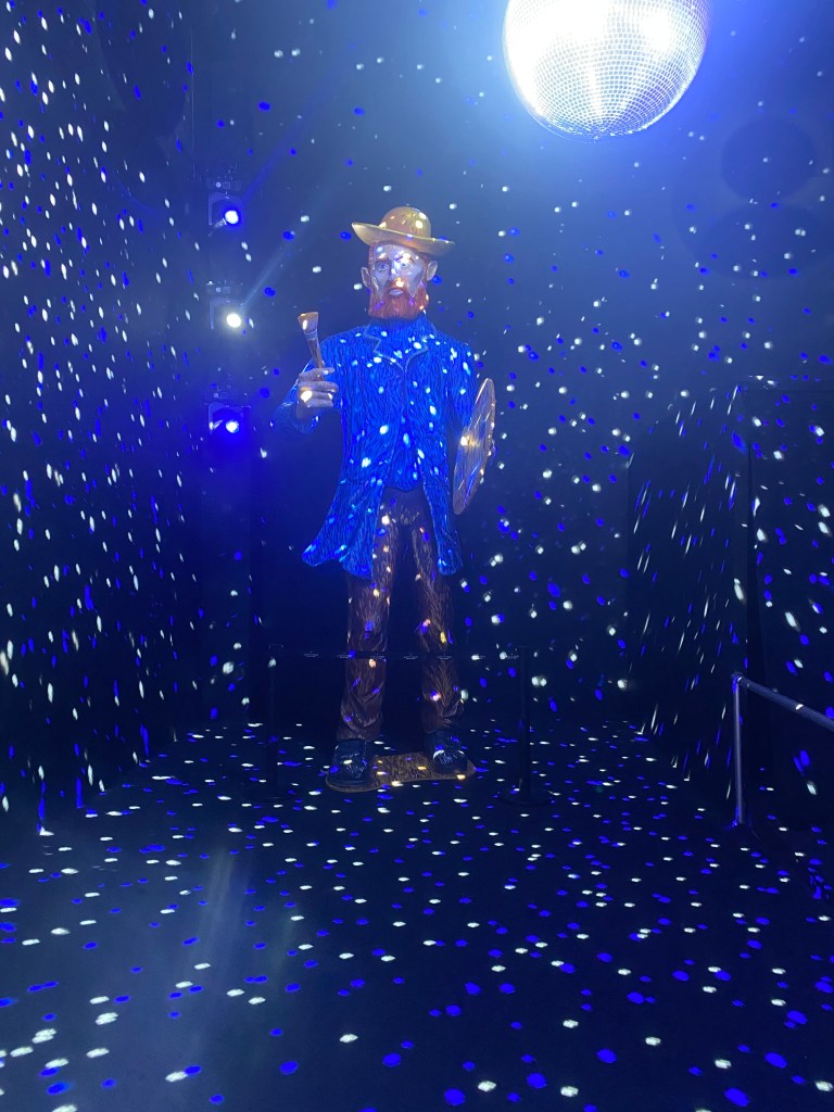 When you first arrive in the exposition, there are dark hallways with mirrors at the end of them reflecting the famous works from Van Gogh that are represented in the walls of the hallways. After passing through the hallways, you enter a room with a mural and columns. The mural talks about the different paints from Van Gogh and the inspiration behind each one of them. While the columns tell the story about the life of the artists. Each column has the year and the important event which occurred in the life of Van Gogh. Finally, the spectators enter a gigantic room in which famous artworks from Van Gogh, like The Starry Night and Vase with Twelve Sunflowers, are being projected in the walls, ceiling, and floor. In that same environment, there is an entrance to a mini cinema where a movie about other impressionist artists (Monet, Cezanne, Renoir, and Gaugin) is being projected. At the end of the exposition, there is a sculpture of Van Gogh.