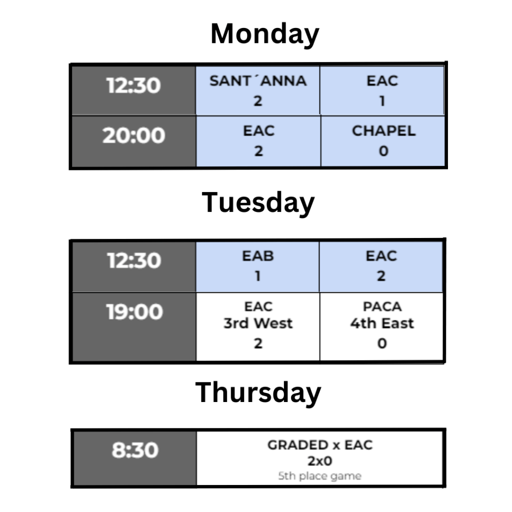The girls, upon arrival also had the opportunity to have a quick practice session to refresh after the long trip to NR 2. Unfortunately on their first day of the season, Monday, they started with a bad turn and lost their first game against Santa´anna 2 to 1. In their second game, the girls brought their giant spirit and fought for a win against Chapel, winning 2 sets. Their next day was tough as they had to beat their first rival, EAB, but with a large point difference to be able to qualify for the semifinals. Their win, 2-1, was strong but unfortunately not strong enough to guarantee a place in the semis. They were instead placed in the fight for 5th or 7th, against PACA, winning 2-0. Because of their strong second day, they were able to play fighting for 5th place against Graded which they unfortunately lost 2 to 0, placing 6th place.