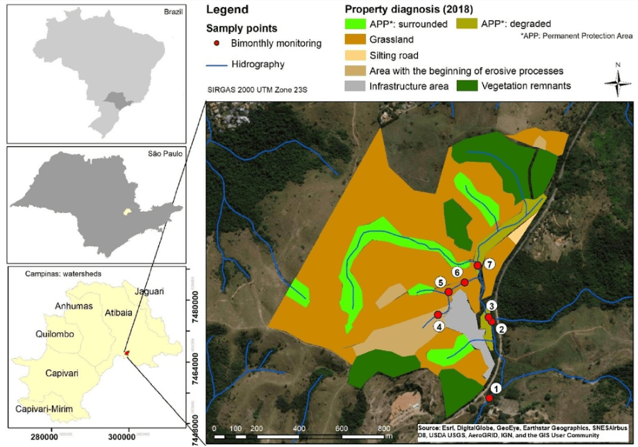In a study conducted by Regina Marcia Longo, Joice Machado Garcia, Raissa Carolina Gomes, and Adélia Nobre Nunes in 2023, over 9 months, these experts collected different water samples from numerous waterways in Campinas, São Paulo, assessing dissolved oxygen, biochemical oxygen demand, pH, temperature, and turbidity, electrical conductivity, dissolved solids, total phosphorus, total nitrogen, and total coliforms. The location of the experiment is shown in the following photo.